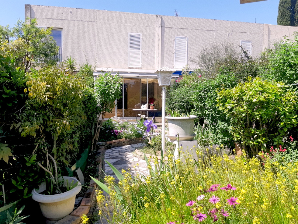 VENDU Exclusivité Hyéres proche toutes commodités au calme ,entourée de verdure en copropriété à faibles charges une villa de 69 m² Carrez avec deux terrasses couvertes donnant un espace vie total de plus de 100 m². En son RDC cette maison est composée d'une entrée, un garage de 16m², une terrasse couverte de 15m², un espace vestibule et bureau,un WC, une piéce de vie avec cuisine ouverte donnant sur véranda de 14m² en accés direct avec en jouissance privative exclusive un joli jardin arboré organisé en "L" avec cabanon en dur un petit bassin, à l'étage deux chambres, une SDE , un WC.